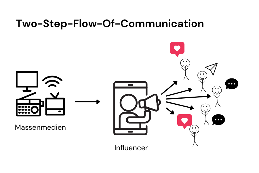 Lazarsfeld et al. (1944) entwickelten die Two-Step-Flow-Theorie, die zeigt, wie Informationen über Meinungsführer:innen – etwa Influencer:innen oder Expert:innen – verbreitet werden. Meinungsführer:innen gelten als glaubwürdig und haben einen direkten Einfluss auf die Kaufentscheidungen ihrer Follower:innen. Die Botschaft wird dadurch effektiver und schneller verbreitet.