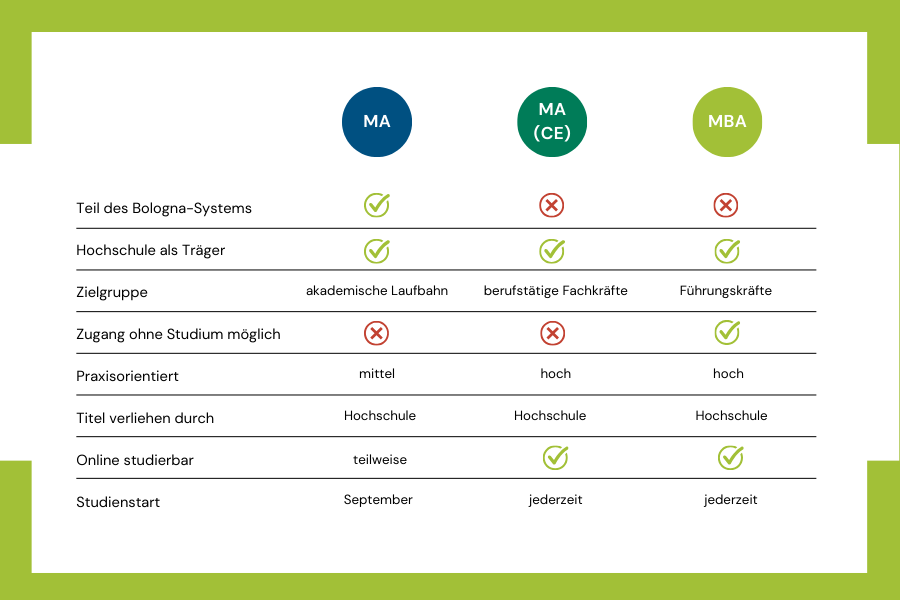 Nicht jeder Master ist gleich. Und genau das kann die Entscheidung für die passende Weiterbildung so komplex machen. Vielleicht haben Sie schon vom „MBA“ gehört – oder vom „MA“ oder neuerdings auch vom „MA (CE)“. Doch was bedeuten diese Abkürzungen eigentlich genau? Wo liegen die Unterschiede? Und vor allem: Welcher Abschluss passt zu Ihnen, Ihren beruflichen Zielen und Ihrer Lebenssituation?
